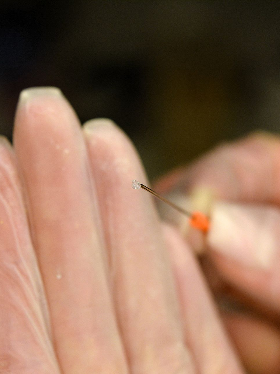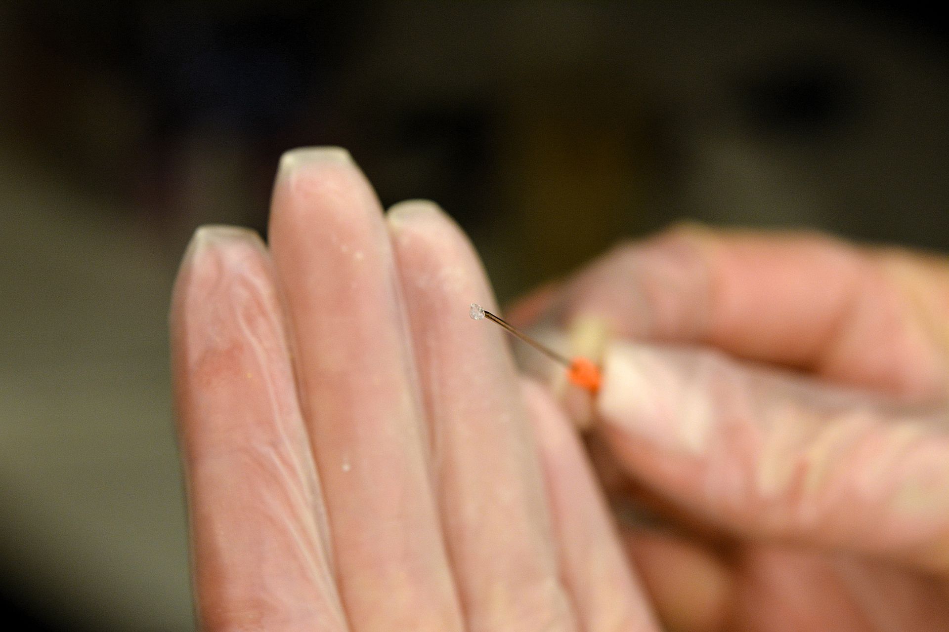 Een foto gemaakt in mijn thuisstudio: Wild DNA Studio & Shop. Dit is tijdens het DNA verwerkingsproces. Op het puntje van de naald die ik in mijn handen houd, zie je een doorzichtig 'wolkje': dat zijn Rafke's DNA-moleculen, vóórdat kleuring plaatsvond. Dit DNA werd door lab-technici van het UMC in Amsterdam geëxtraheerd in het kader van genetisch onderzoek naar de zeldzame mutatie van Rafke.